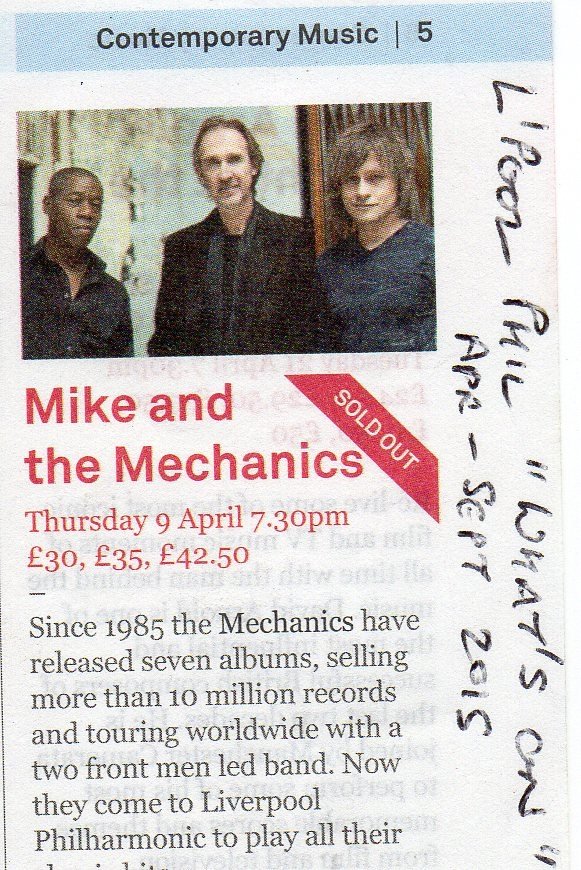 Set List: Are You Ready/Another Cup Of Coffee/Get Up/Silent Running/Don't Know What Came Over Me/The Best Is Yet To Come/Land Of Confusion/High Life/ Wonder/A Beggar On A Beach Of Gold/Let Me Fly/Cuddly Toy/I Can't Dance/Over My Shoulder/All I Need Is A Miracle/Living Years/Word Of Mouth