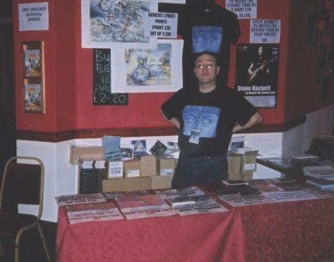 Once again, a few familiar faces appeared including another long distance fan: Roger Salem who had travelled in from Switzerland and whom I had had the pleasure of meeting previously at Musical Box gigs both here in the UK and in Canada. There was also the presence of a weird and (hate to sound rude but…) irritating American fan who continually badgered both myself and Andy for a free T shirt simply on the grounds that he had flown from the US for the show - that being the case my friend Peter should have had his pick of the merchandise! Unusually, the venue had advertised this gig as having a "support" act with one unfortunate side effect: a LOT of fans arrived late and were not best pleased to discover that they had missed part of Steve's set! I kept a weather eye out for Ian and James Macpherson and they duly arrived and with a judicious nod to Paul Clark, they were both ushered upstairs for that IMPORTANT meeting that Steve and James had been discussing at Leicester. I have to admit, that because of the fact that there was also a play going on in one of the other halls in the complex, the stall could not be left unattended and it fell to me and Andy to look after it whilst John attended to other business; I did NOT actually see this gig … apart from Spectral Mornings which I made a point of seeing, although I missed the intro! Imagine my surprise therefore when I found out afterwards that Steve had not only dedicated Spectral Mornings to James but had also thanked all of the crew (including me!) from the stage… Oh for a recording of THAT gig! |